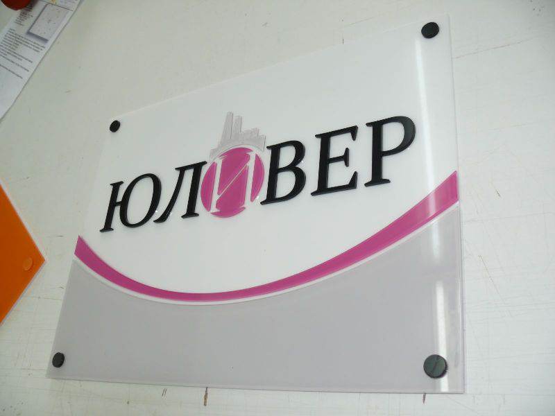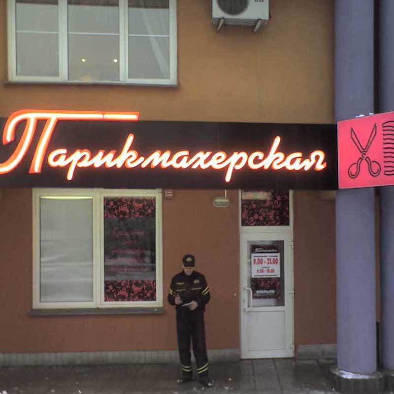 - Вывески – бывают плоскими, с подсветкой, объемными, в виде отдельных фигур. Лаконично информируют том, что находится в здании.